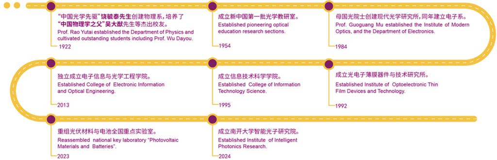 学院是在实力雄厚的物理学科的基础上发展起来的。1984年成立电子科学系、现代光学研究所,1992年成立光电子薄膜器件与技术研究所。为适应信息技术和产业的发展,于1995年联合计算机与系统科学系和智能机器人研究所组建信息技术科学学院。为加快南开大学现代工学学科体系建设,于2013年新组建电子信息与光学工程学院。2024年重组光伏材料与电池全国重点实验室,2025年成立南开大学智能光子研究院。